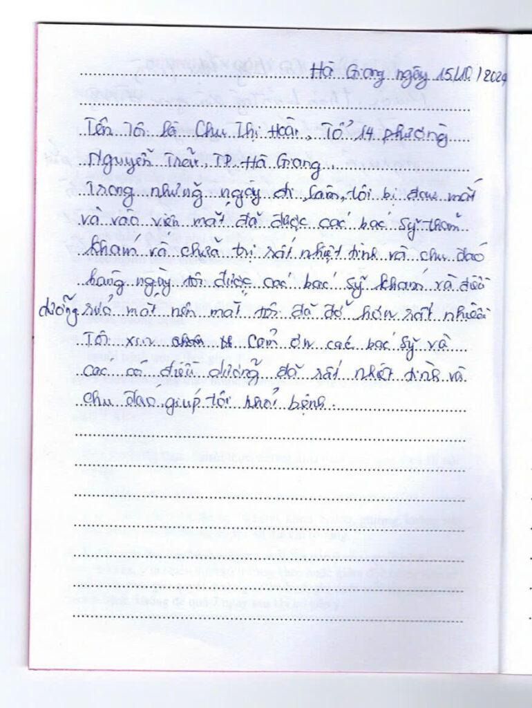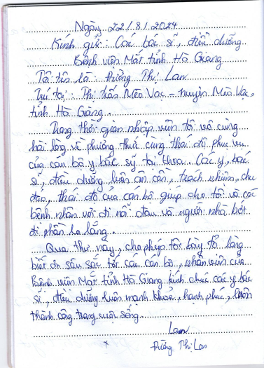 Trong thời gian qua, Bệnh viện Mắt tỉnh Hà Giang đã nhận được nhiều thư cảm ơn của người bệnh và các gia đình người bệnh gửi tới động viên tập thể y bác sĩ đang công tác tại bệnh viện. Những lời thư chân thành, đầy tình cảm của các gia đình là động lực giúp đội ngũ nhân viên y tế chúng tôi thêm vững vàng, tự tin và tận tụy hơn với nhiệm vụ bảo vệ sức khỏe cho nhân dân.