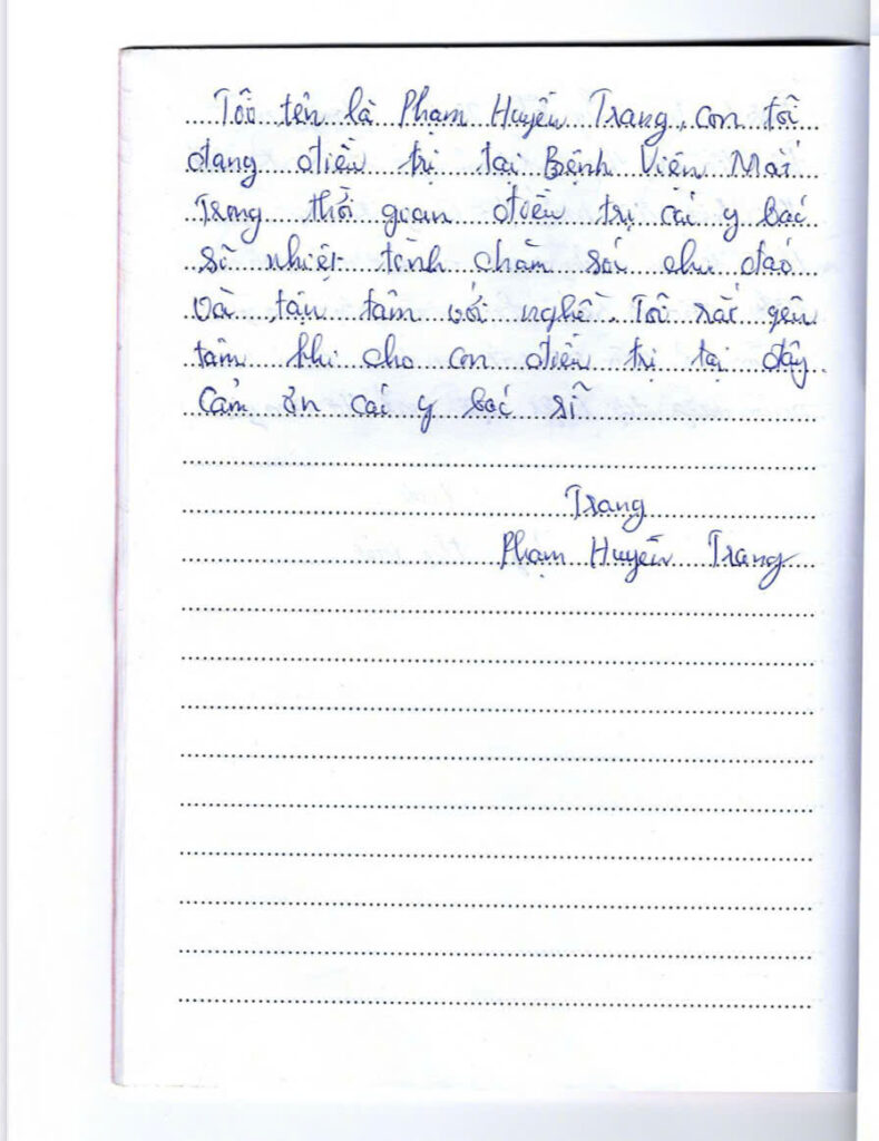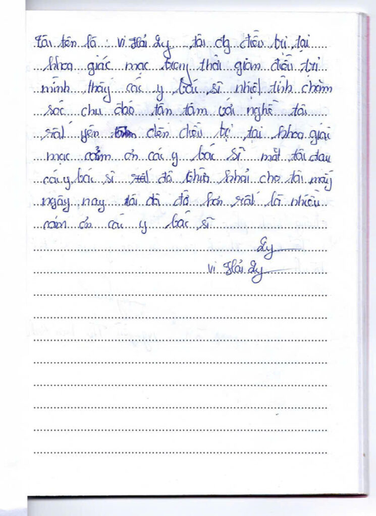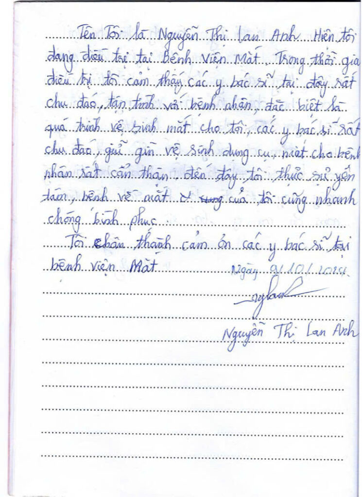 Thư khen ngợi của bệnh nhân điều trị tại Bệnh viện Mắt